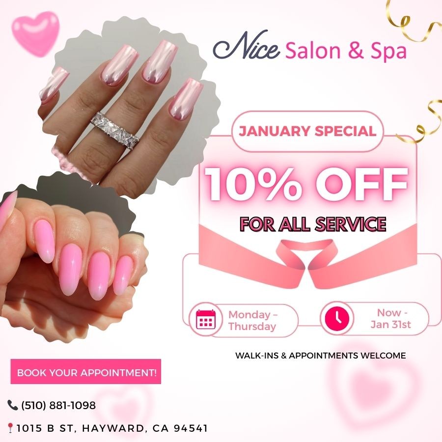 Located conveniently in Hayward, CA 94541, Nice Salon & Spa is the ideal nail salon for you to escape from all the stresses as well as tiredness to enjoy the most comfortable moments.
